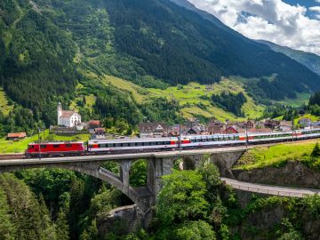 Begin on the boat, gliding across Lake Lucerne to Flüelen, enjoying views of Mount Pilatus and Mount Rigi. Then board the train southwards, travelling first class through mountain passes, spiralling tunnels, and dramatic valleys.
