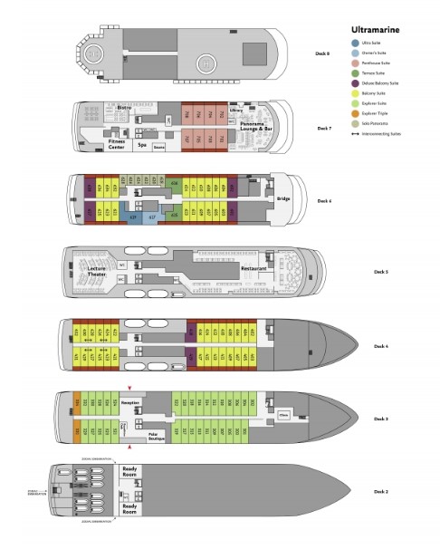ULTRA SUITE: Located on Deck 6, with approximately 563 sq. ft. (52.3m2) of interior living space, and a 46 sq. ft. (4.3 m2) balcony. This suite is perfect for guests who want to travel without compromise. Our largest and most luxurious suite features the most sleeping, entertainment and storage space onboard the ship. It is perfect for families or travellers who want all the comforts of home onboard the ship.