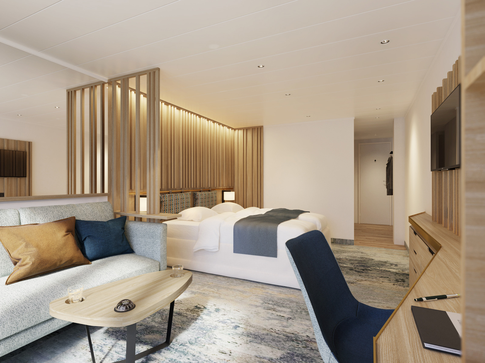 PENTHOUSE SUITE:The only suite category to be located on Deck 7, with approximately 369 sq. ft. (34.3 m2) of indoor living space, and a 67 sq. ft. (6.2 m2) balcony. This suite is perfect for guests wanting to wake up to unobstructed polar views from the warmth and comfort of their bed onboard the ship. These suites offer the best of everything—views, spacious interiors, full bathrooms and generous balcony sizes—as well as easy access to the wellness centre.
